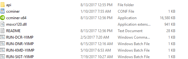 To get started lets get the CCMiner 2.2 files from Github here: https://github.com/tpruvot/ccminer/releases/tag/v2.2-tpruvot. You will want the ccminer-x64-2.2.7z files. Once download extract them to your desired directory. Your folder will contain the following files: